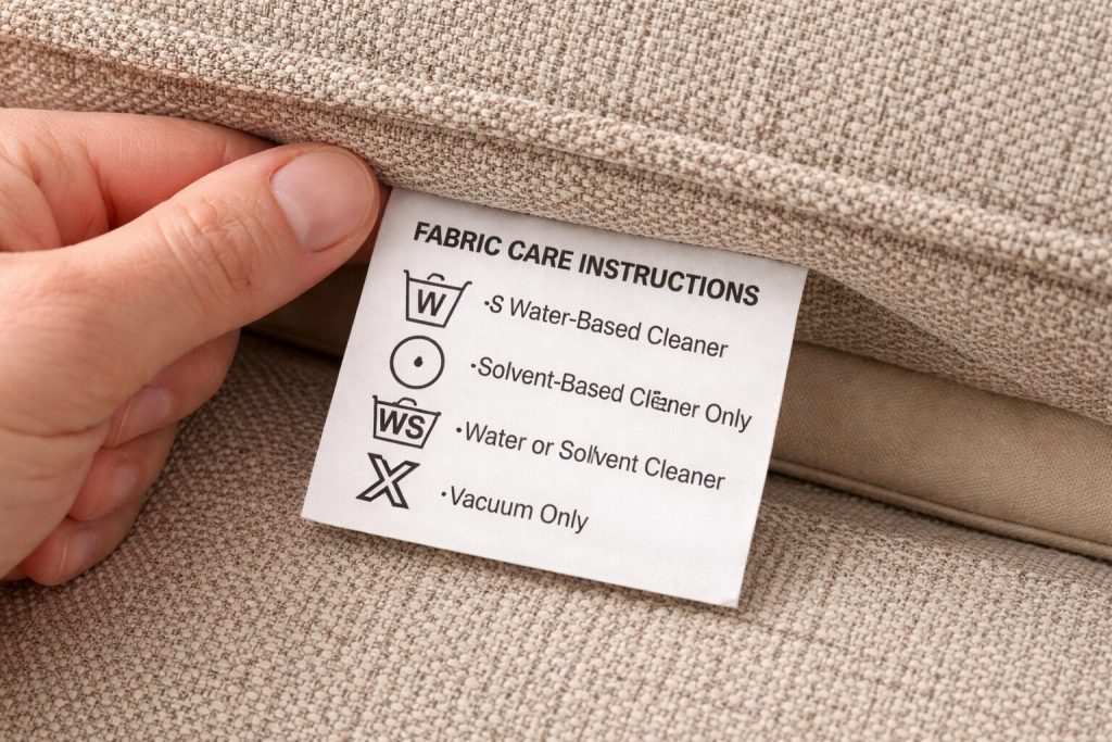 For removable textile covers, ironing guidance may be relevant. If the fabric can be ironed, indicate the appropriate temperature. If ironing would damage the material (common with certain synthetic upholstery fabrics), that warning belongs on the label.